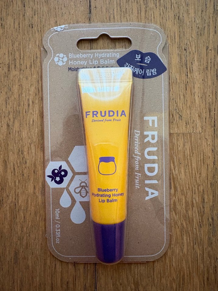 FRUDIA Blueberry Nemlendirici Dudak balmi, yaban mersini ve bal özleriyle nemlendirici bakım sağlar. Canlı sarı tüpte pratik kullanıma uygun.