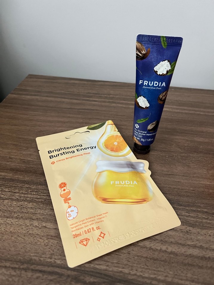 FRUDIA cilt bakım seti, cildi canlandırmak ve yenilemek için aydınlatıcı maske ve besleyici peeling kremi içerir.