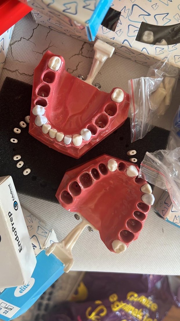 Beyaz diş parçaları ve renkli diş etleri içeren diş modeli kiti, eğitim veya gösterim amaçlıdır.