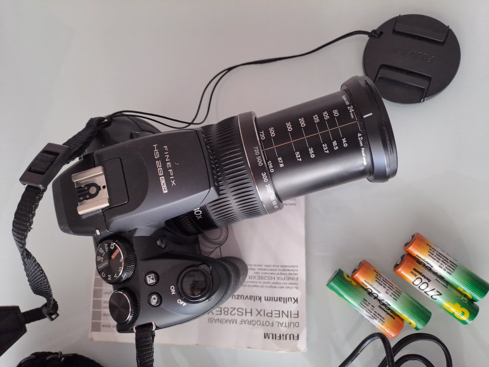 Uzun zoom lensli siyah Fujifilm dijital fotoğraf makinesi, taşıma çantası, USB kablosu ve pillerle birlikte. Lens kapağı ve kullanım kılavuzu da var.