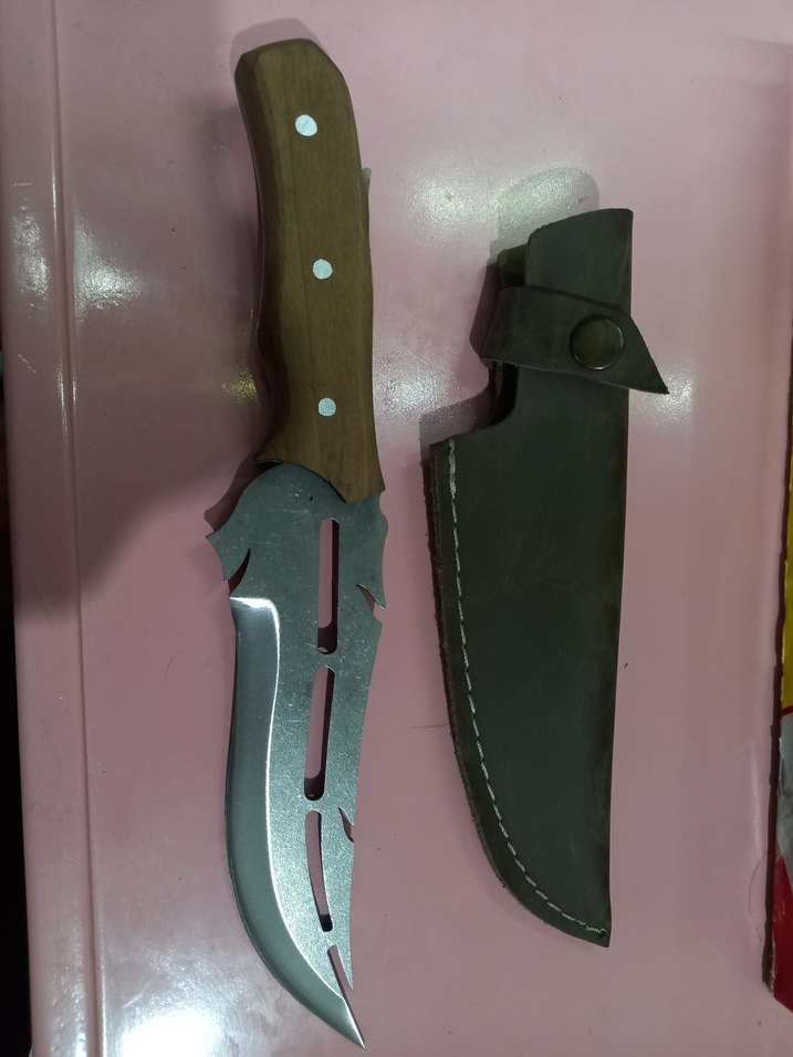 Kahverengi ahşap saplı ve özel tasarımlı bıçağa sahip av bıçağı, kahverengi kılıf ile birlikte sunuluyor.