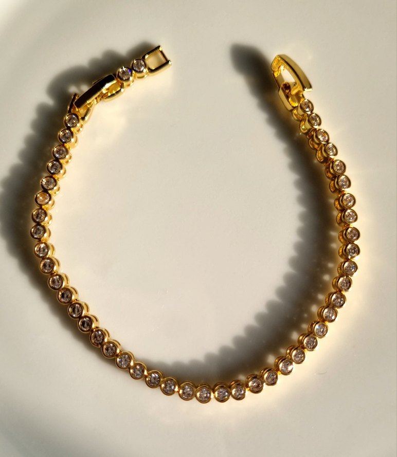 Zincir detaylı, parlak altın renkli bileklik, klasik şıklık katmak için ideal. Vip ürünler pirinç (bronz) hammaddesi kullanılarak üretilmektedir. Kaplamaları üst kalite olan bu ürünler, sıvıya karşı dayanıklı, kararma yapmayan, antialerjik ve günlük kullanıma uygundur. Ürün süslemelerinde kullanılan taş cinsi zirkon taştır.