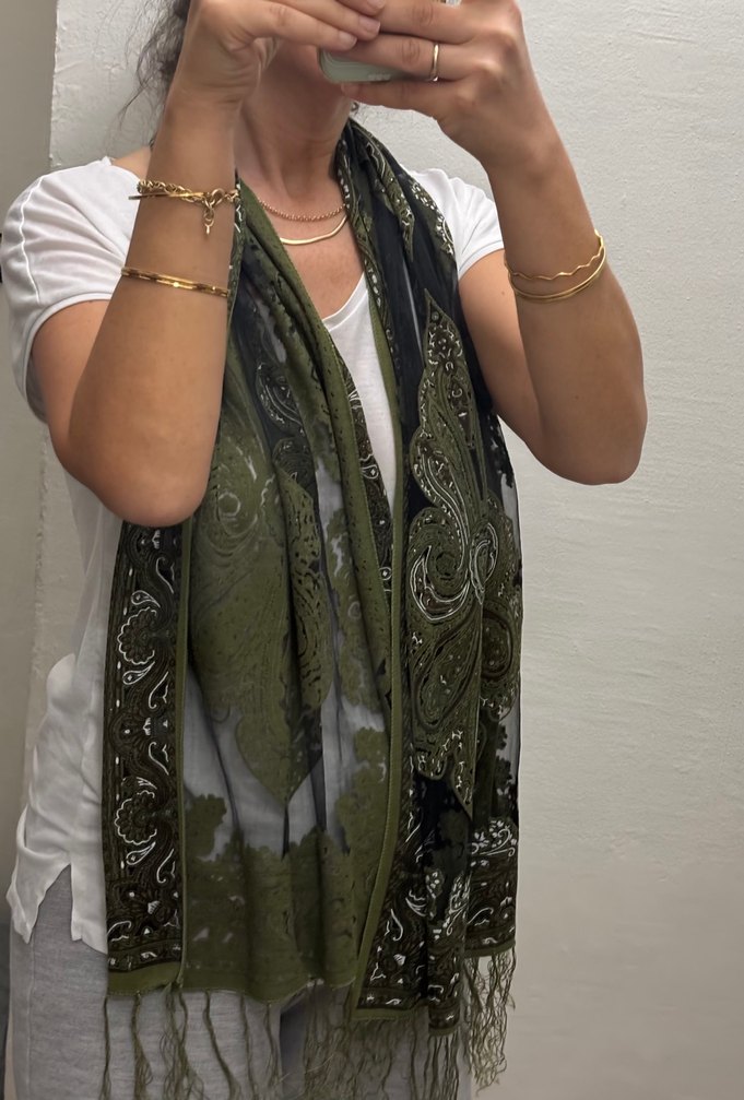 Boyu 160 cm püsküllüleri hariç eni 50 cm ince tül dokuma haki yeşil fular baş örtüsü eşarp yeni çok az kullanılmış kusuru yoktur