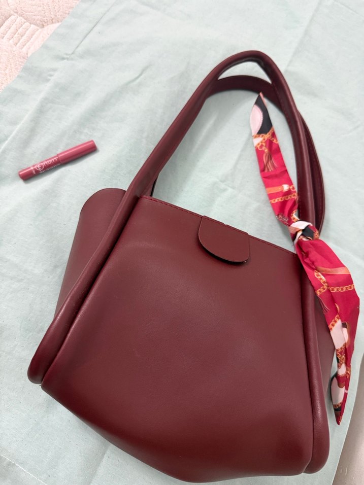 Çanta hiç kullanılmadı fularlı bordo renginde el çantası yanında dudak kalemi hediyeli flormar
