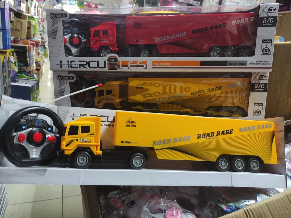 Sarı oyuncak kamyon renkli detaylar ve "Road Rage" yazısıyla. Ayrılabilir römork ve gerçekçi tasarıma sahip. Oyun için uygun.