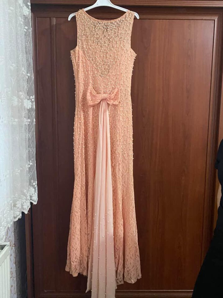 Full İnci detaylı, uzun ve pudra pembesi abiye elbise, fiyonk süslemeye sahiptir. Düğün ve özel davetler için uygundur. Yıkanması gerekiyor. Sadece Bir ya da İki kez giyildi