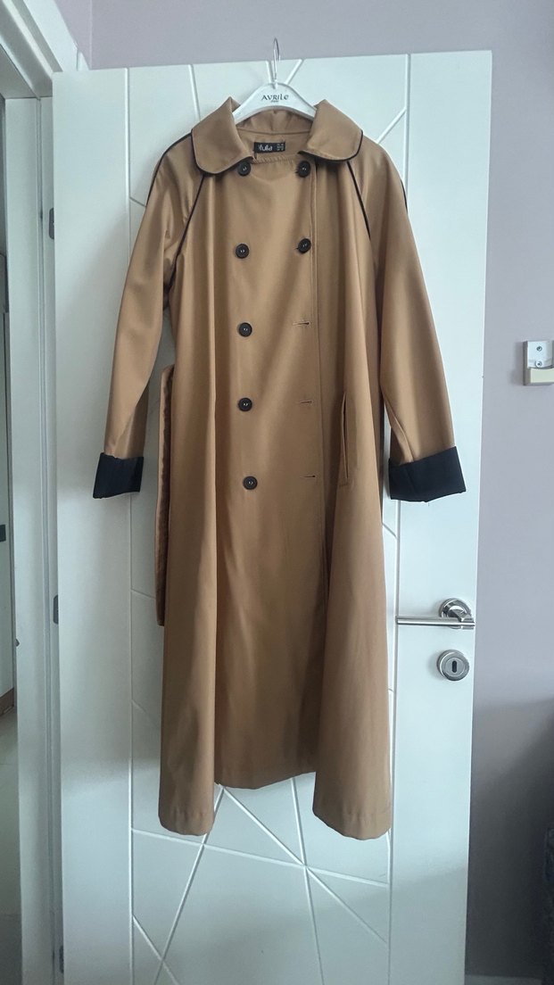 Bej renkli, uzun, düğmeli, yakalı ve kemerli kadın trençkot. YENİ ETİKETLİ. Uzun kollu, koyu manşet detaylı, sentetik kumaştan, rahat kesim. 46 Beden. Uzunluğu 110cm.