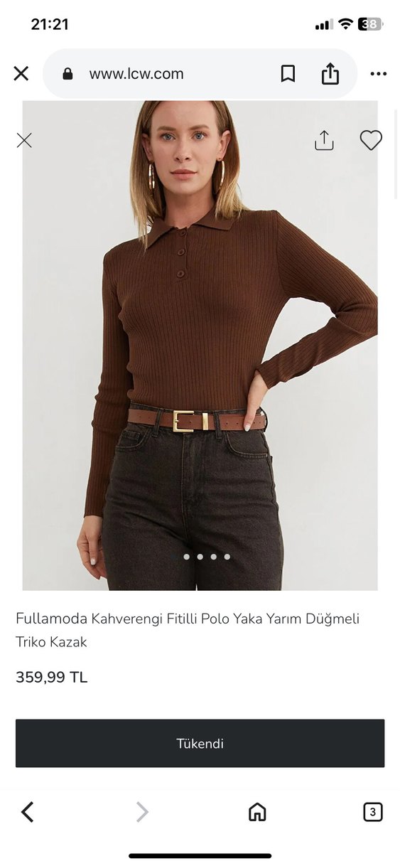 Kahverengi fitilli triko kazak, polo yaka ve yarım düğmeli detaylıdır. Uzun kollu ve beli kemerli, günlük sokak stiline uygundur.