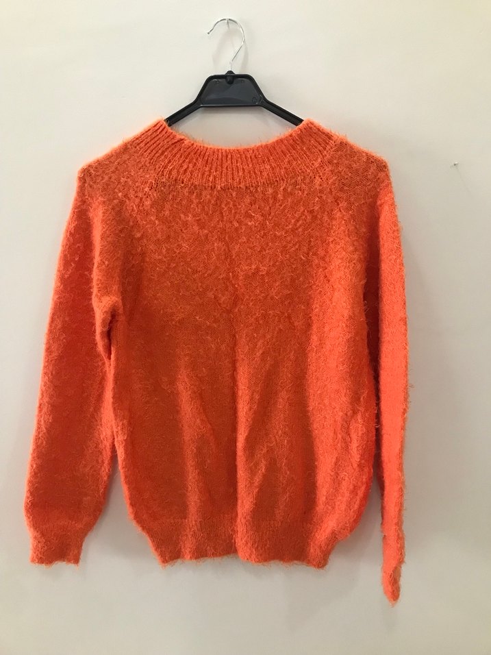 Turuncu renkte, yuvarlak yakalı ve uzun kollu örgü kazak. Rahat, bol kesimiyle günlük kullanıma uygundur.