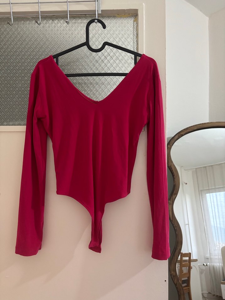 Fuşya renkli, V yakalı ve uzun kollu kadın bluz, drapeli detaylı ve sade tasarımlı. Sentetik kumaştan, midi boyda ve günlük kullanıma uygun.