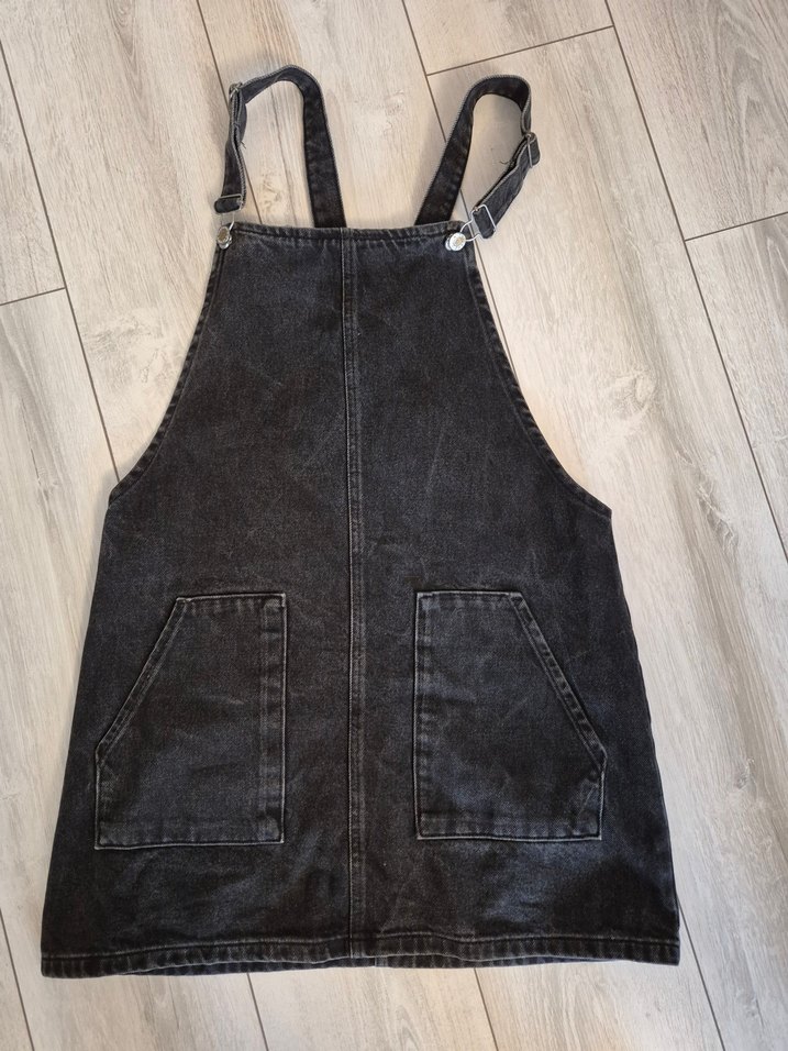 Füme denim kısa tulum, bol kesim ve ayarlanabilir tokalı askılarla. Önünde büyük cepler ve yüksek yakası var. Günlük kullanım için uygun. boyu askıdan itibaren 83 santimetredir s ve M beden uyumludur