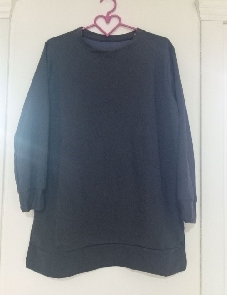 füme renkli, yuvarlak yaka ve uzun kollu kadın sweatshirtü, rahat kesimi ve midi boyuyla gündelik kullanıma uygundur. Yumuşak ve sıcak dokusu vardır.