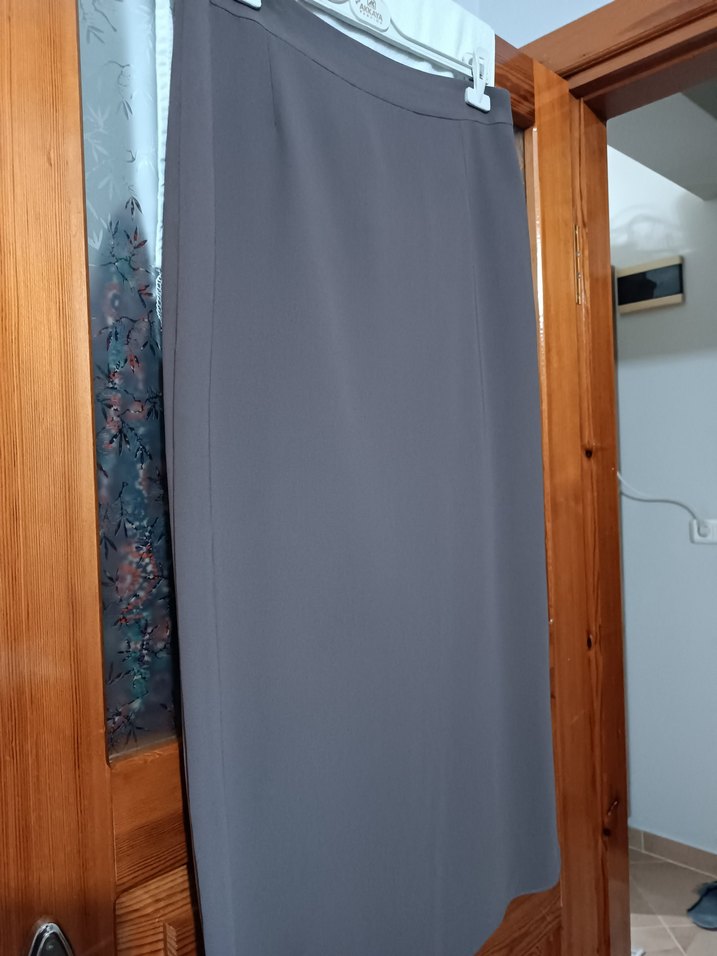 Füme renkli, drapeli detaylı, düz kesim uzun kadın eteği. Sentetik kumaştan üretilmiş olup, iş ortamları için uygun, sade ve modest bir tasarıma sahiptir.
