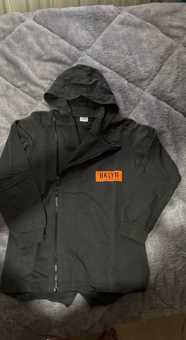 Yumuşak fleece kumaştan yapılmış, fermuarlı ve kapüşonlu, füme renkli,kapşonlu erkek sweetshirt Göğsünde BKLYN baskısı bulunur.