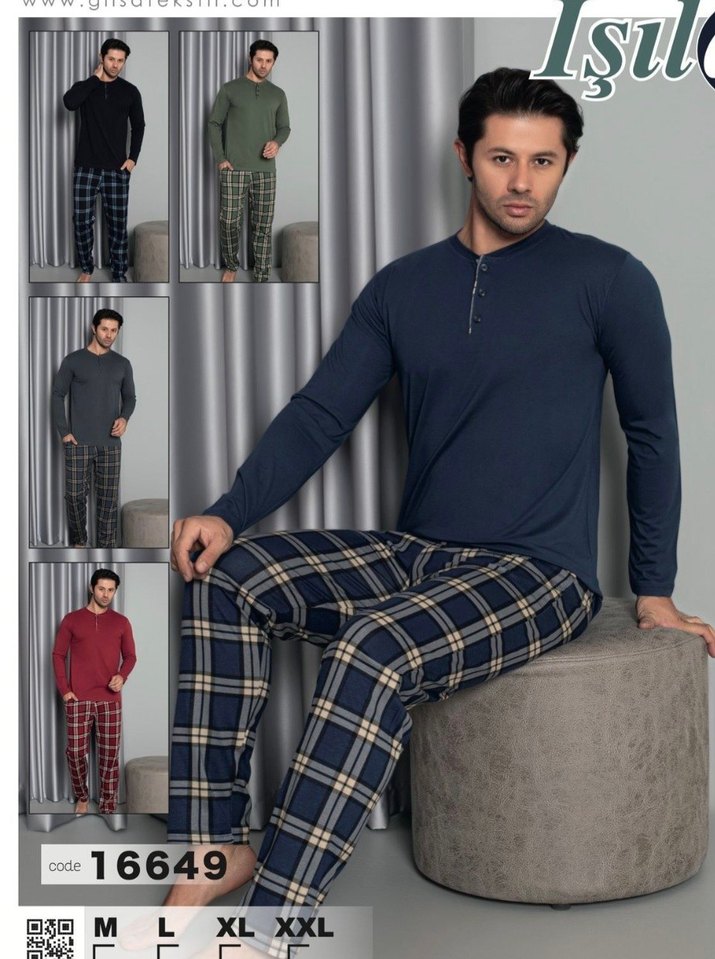Uzun kollu, bisiklet yaka üst ve koyu gri kareli pantolonlu erkek pijama takımı. Rahat kesimi ve çağdaş tasarımıyla şıklık sunar. M, XL, XXL beden seçenekli. ️