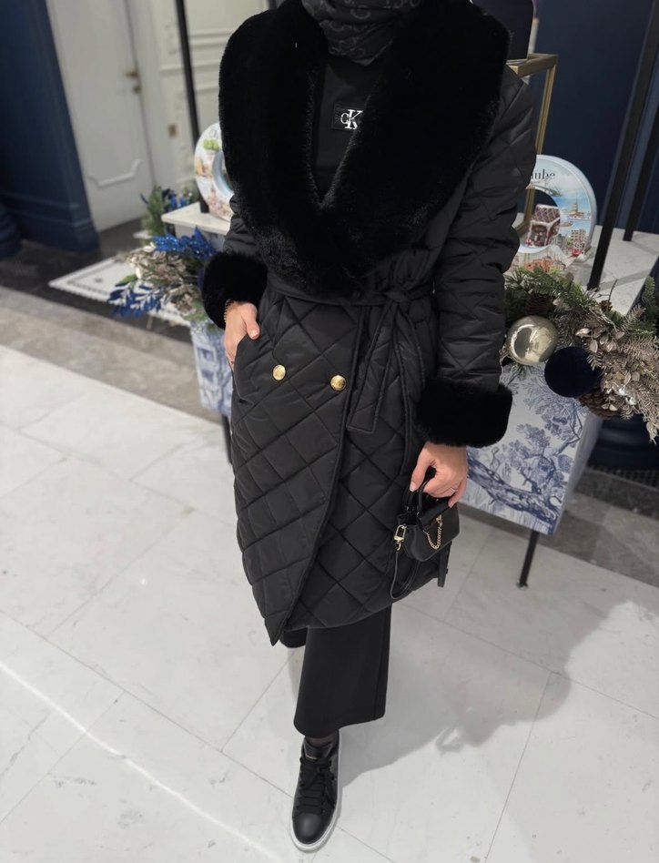 Kürk detaylı, füme renk uzun kadın kaban. Notlu yaka, çıtçıtlı ve kuşaklı, günlük kullanıma uygun rahat kesim.