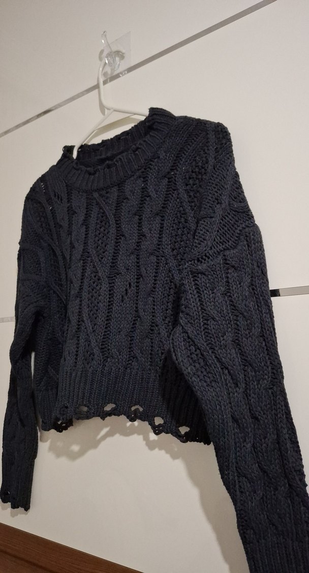 Yırtık detaylı. Füme örgü kazak, uzun kollu ve yuvarlak yaka ile rahat bir kesime sahip. Günlük kullanıma uygun, rahat ve gotik tarzda örülmüş. S-M uyumludur.
