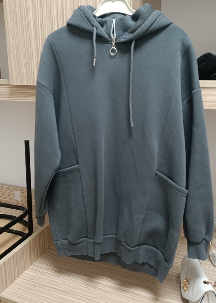 Boyun kısmı kısa fermuarlı yanda iki cepli oversize füme sweatshirt S ve M beden aralığındaki herkese olur