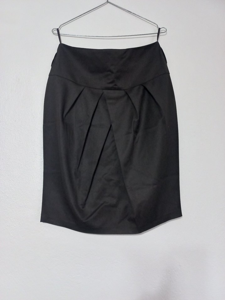 Fitted kesim, pile detaylı siyah midi kalem etek. Keten kumaştan, minimalist ve gotik tarzda, ofis için uygundur. Bir kez kullandım hiçbir sorunu yoktur.
