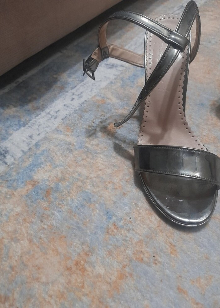 Füme rengi 39 numara topuklu ayakkabı bir tarafın topuklu kısmını soyulmuştur topuk boyu 10 cm dir