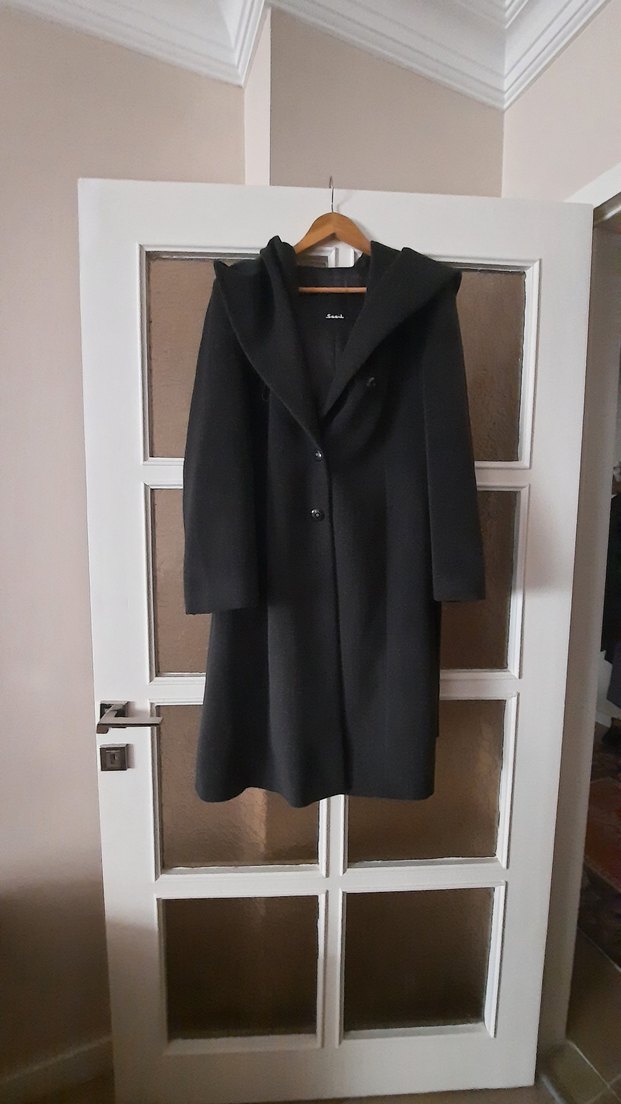 Füme renkte, geniş yakalı uzun kollu kaban,manto. Düğmeli kapama ve düz kesimlidir. İki koltuk altı arası 58 cm. Boyu 104 cm.
