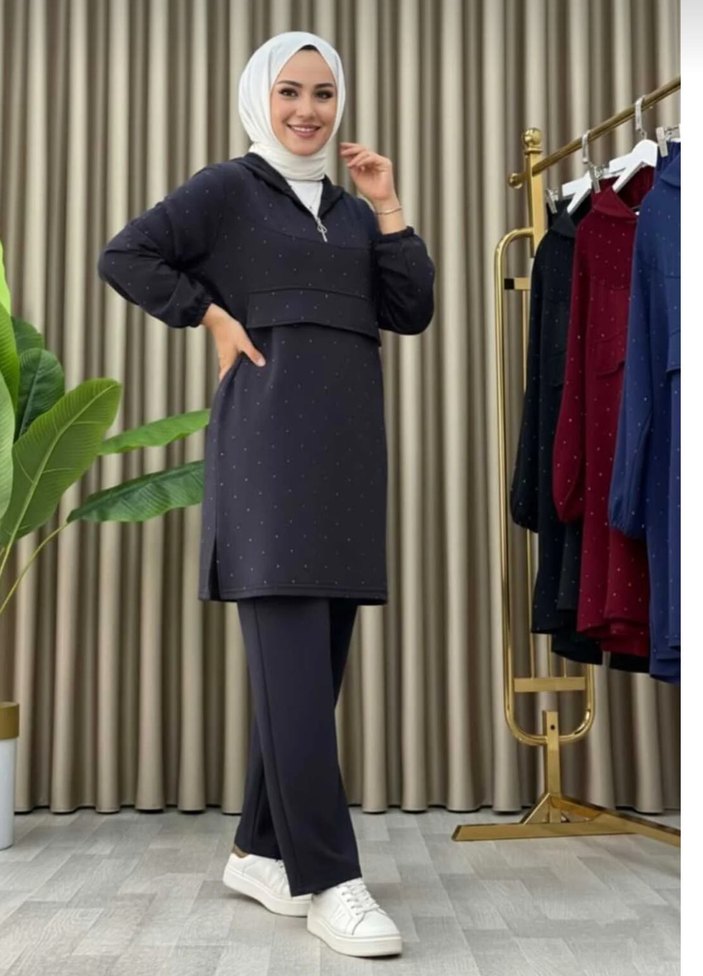 füme renk taşlı kapşonlu ikili takım