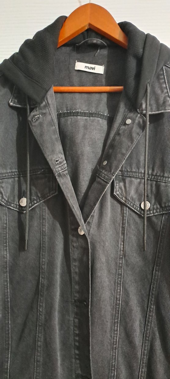 füme renkte, düğmeli, notched lapel yakalı ve askılı kollu bol kesim kadın denim cekettir. Günlük kullanıma uygundur. XXL uyumlu