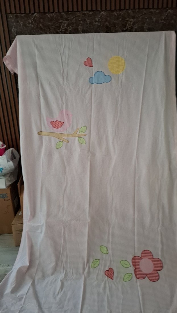 (145cm × 240 cm) 2 kanat . Pastel pembe renkte, kuş, kalp, bulut, güneş ve çiçek desenli yumuşak pamuklu kumaştan çocuk odası perdesi