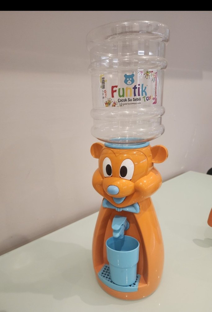 Renkli turuncu ayı figürlü çocuk su sebili, üzerinde 'Funtik' yazısı bulunur ve mavi bardak ile birlikte gelir. çocuk için olduğundan (1-3yaş) su akışı incedir. üründe sorun yoktur.