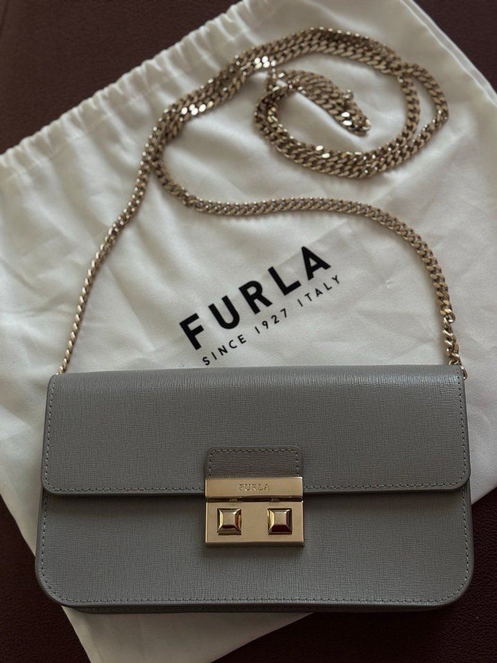 Furla marka gri deri kadın çanta, tokalı kapama ve zincir askıya sahip. Günlük ve gece kullanım için uygun.