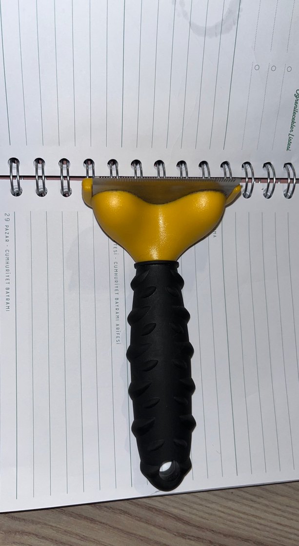 Sarı başlıklı ve siyah dokulu saplı renkli kedi tüyü toplayıcı. Gevşek tüyleri kolayca temizler.