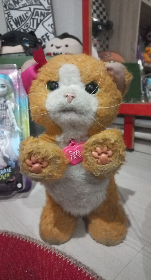 Yumuşak tüylü, detaylı patili renkli peluş kedi oyuncak, üzerinde "FurReal Friends" yazılı pembe kalp etiketi ile, orijinaldir ve çok eski bir seridir. Ne yazık ki çalışmıyor