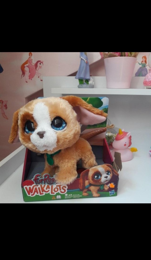 FurReal Walkalots kahverengi ve beyaz yumuşak kumaştan yapılmış, büyük mavi gözlü peluş köpektir. Yeşil tasması vardır ve sarılmak için uygundur.