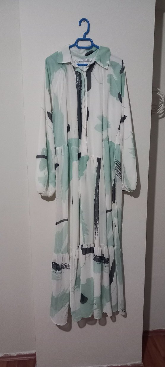 Yumuşak sentetik kumaştan yapılmış, yüksek yakalı ve uzun kollu bu uzun elbise, pastel yeşil batik desenli ve bohem tarzı yansıtıyor. Drapeli detaylara sahip.Boydan boya içi astarlidir.Düğmeler yarıya kadardır.