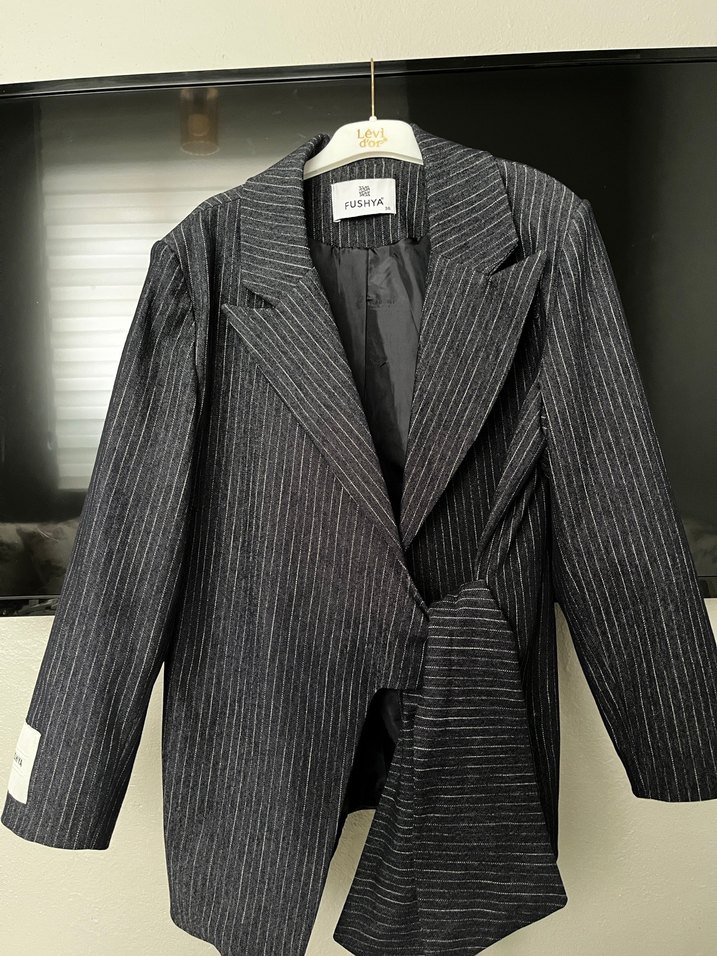 Lacivert çizgili, kot kumaştan uzun kesim kadın blazer. Polo yaka. Ofis ve sokak stili için uygundur. Hiç giyilmemiştir sadece etiketi yoktur fushya markasına aittir