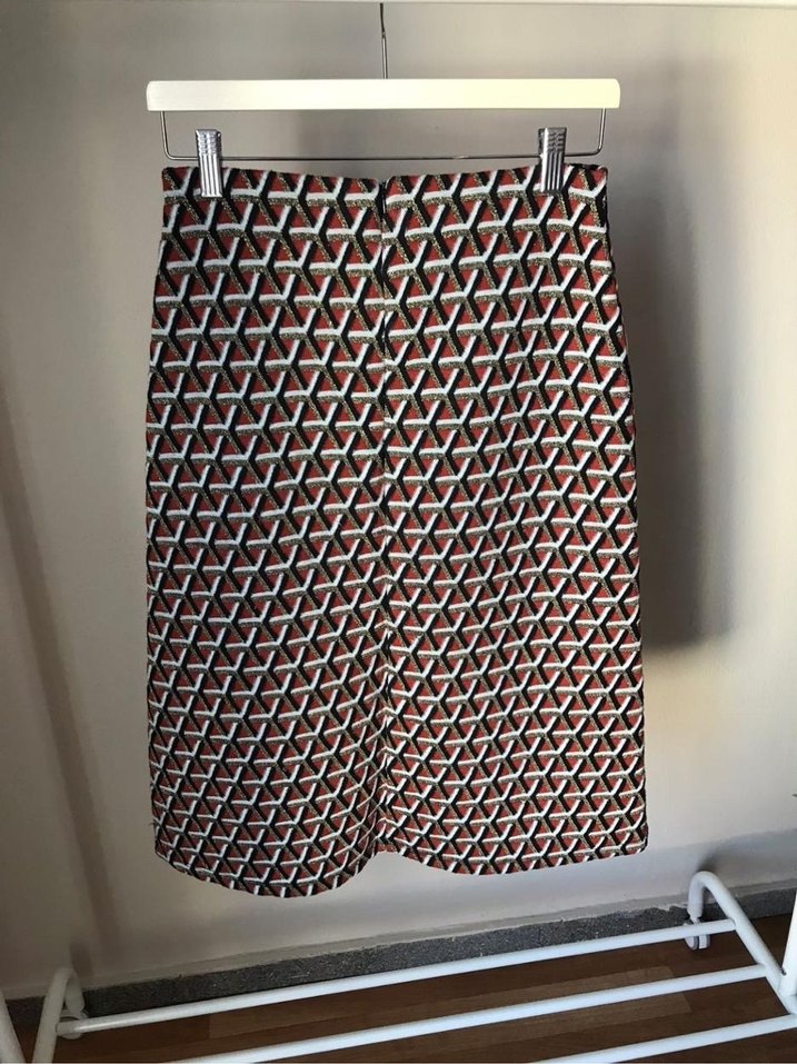 Kalın kumaştan, karışık renkli geometrik desenli, dar kesim etek. Günlük kullanıma uygun simli dokuma, bel kısmı içerden kalın lastikli, 36 beden, 38 uyumludur.