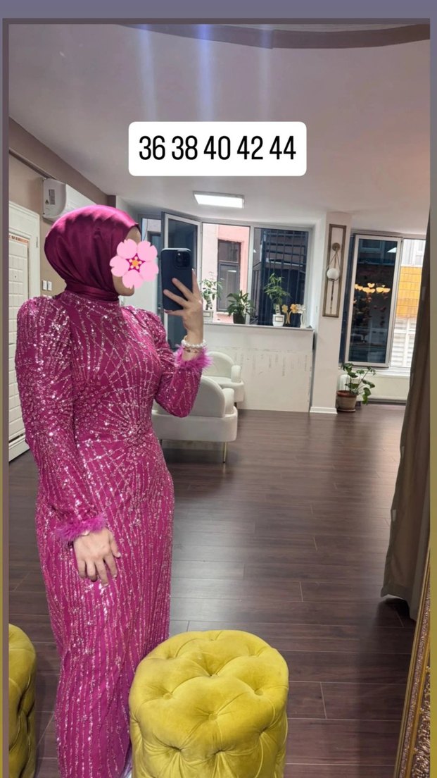 Uzun kollu, yüksek yakalı, pembe payetli ve batik desenli, vücuda oturan abiye elbise. 36-44 beden seçenekleri mevcuttur. ✨