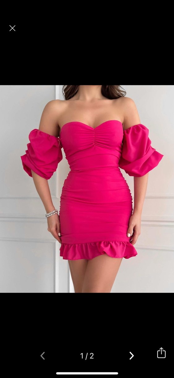 Pembe straplez mini elbise, vücuda oturan kesim ve fırfırlı kollarla. Pürüzsüz sentetik kumaştan, gösterişli partiler için uygun. Hiç giymedim esra helvacıdan aldım L beden olmasına rağmen darı M beden uyumlu