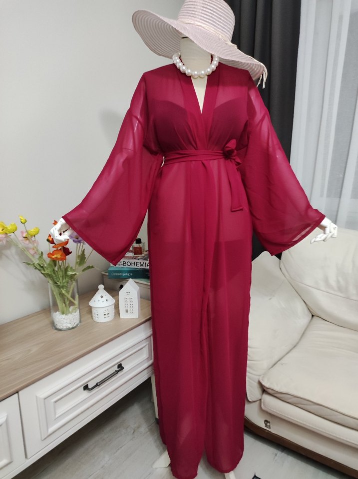 fuşya renkli, uzun kollu ve bol kesim bohem tarzda uzun pareo. Renkli ve desensiz tasarımıyla rahat bir görünüm sunar.