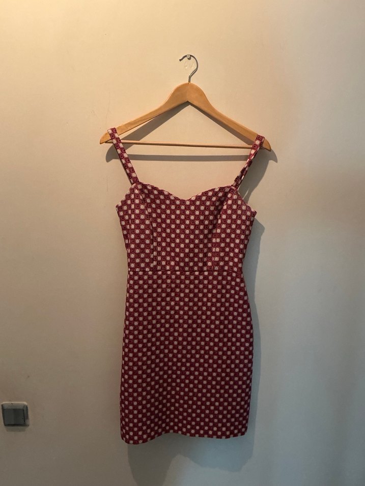 Fuşya renkli, puantiyeli, ince askılı ve kalp yakalı bu dar kesim midi elbise düğme detayına sahiptir. Sentetik kumaştan, bohem ve retro tarzıyla romantik akşamlar için uygundur.