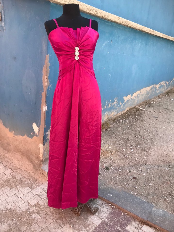 Fuşya renkte,askılı ve drapeli tasarıma sahip uzun, kolsuz abiye elbise. Göğüs kısmında süslemeler bulunur, şık ve klasik bir duruş sağlar. 36 beden. Oldukça iyi durumda.