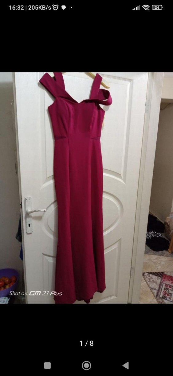 fuşya renk, drapeli ve V yakalı, kolsuz uzun abiye elbise. Modern klasik tarzda, düğünler için uygun, düzenli kesim.