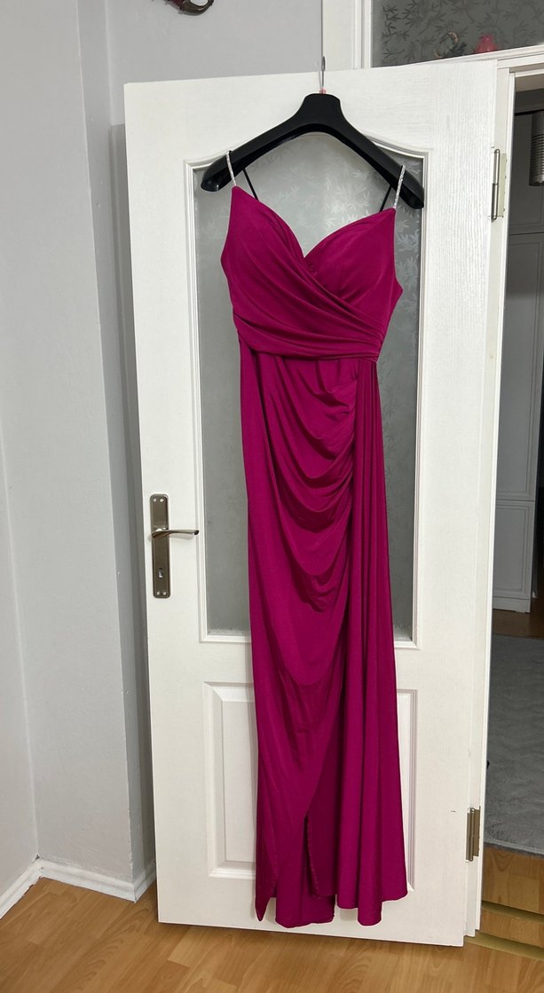 fuşya Drapeli Uzun Abiye Elbise yırtmaçlı