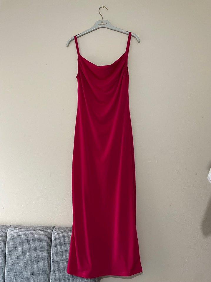 Fuşya Drapeli Uzun Saten Elbise