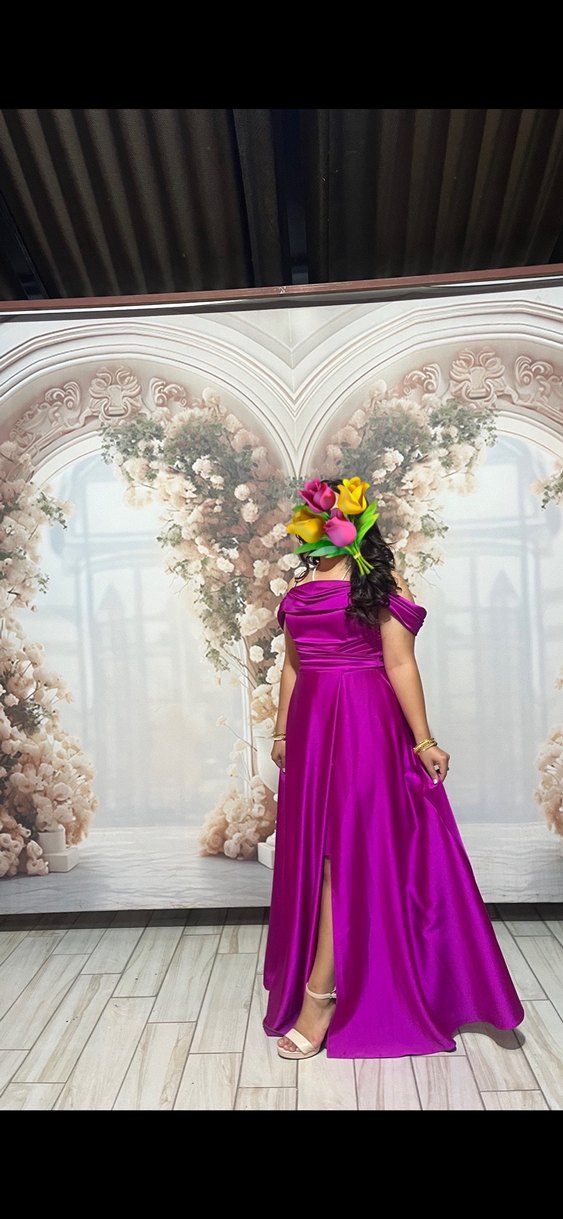 Fuşya renkli, straplez yaka ve drapeli detaylı, uzun boy, ince kesim kadın elbisesi