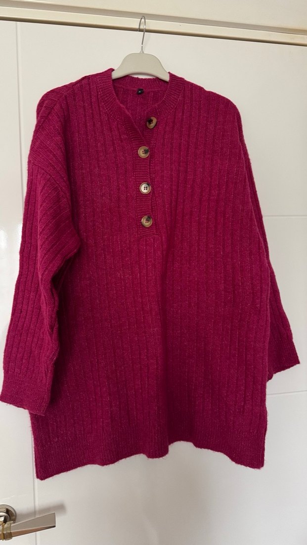 Boyu 76 eni 64 cm tesettüre uygunnFuşya renkli, düğmeli ve yuvarlak yakalı kadın triko kazak. Uzun kollu, salaş kesim ve rahat bir kullanım sunar. Günlük kullanıma uygundur.