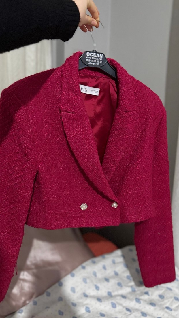 Fuşya renkte, düğmeli ve triko kumaştan yapılmış kadın blazer. Notlu yakası, uzun kollu ve salaş, midi boy kesimi ile günlük sokak tarzına uygun. Kusursuz