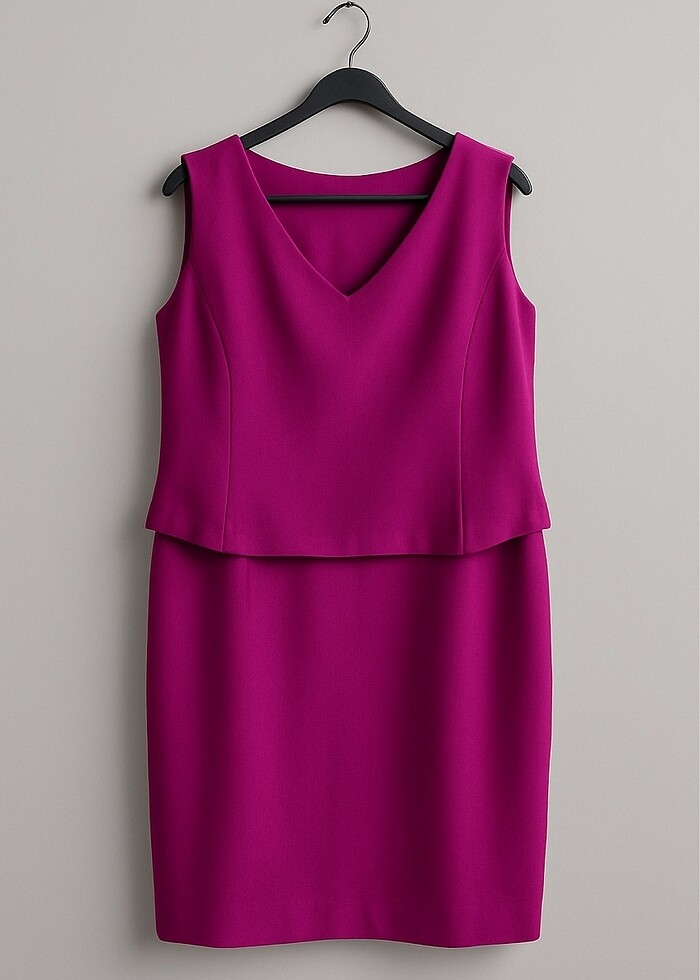 kolsuz ve fuşya renginde şık bir model. Ön kısmında V yaka bulunuyor ve bel kısmında sanki iki parça gibi görünen, vücut hatlarını dengeleyen bir katman (peplum tarzı) var. Arka kısmında ise düz bir kesimle birlikte alta doğru küçük bir yırtmaç yer alıyor.