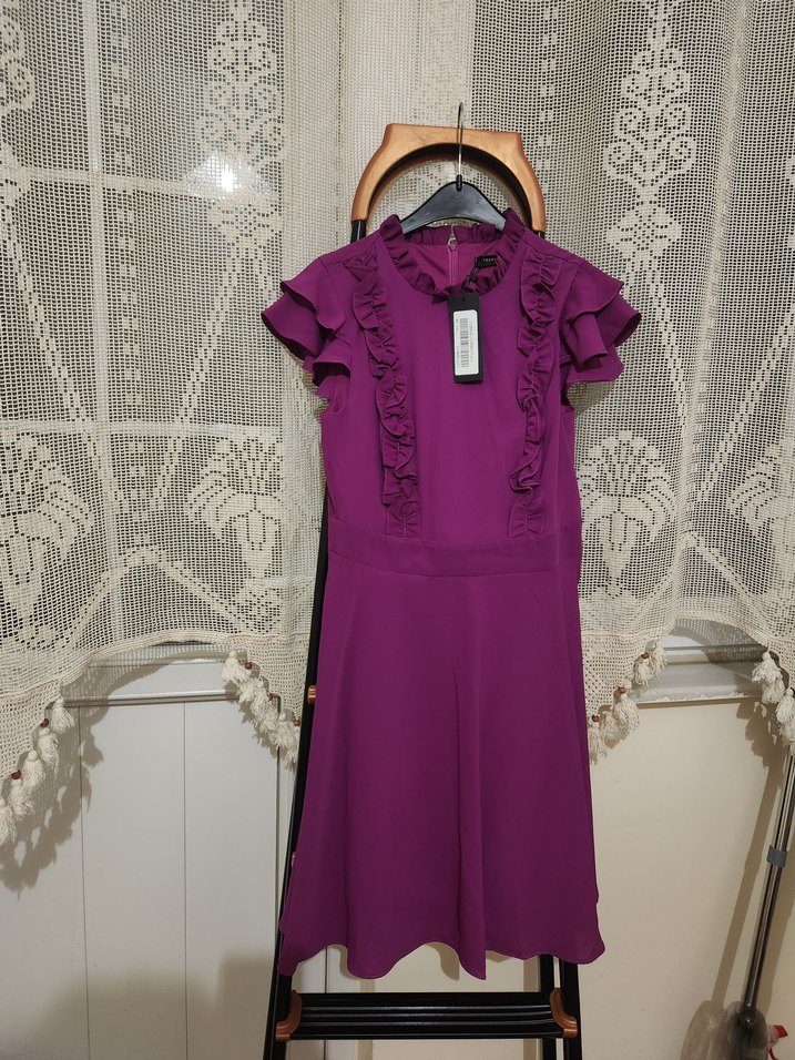 Kumaşı şifona benzer gösterişli bir kumaş ancak asla iç göstermez. Ben internetten almıştım ancak daha küçük beden almam gerekirmiş büyük geldiği için hiç giyemedim, fotoğrafta gördüğünüz gibi sıfır etiketiyle duruyor. özel günlerde, ofiste çok şık duracak romantik bir elbise. boyu 93 cm. mor işaretlemek durumunda kaldım ancak fuşyadır.