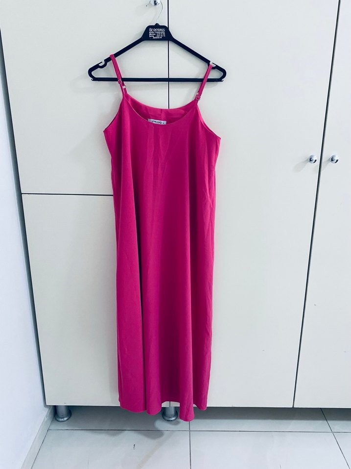 Pembe askılı, salaş kesim midi elbise. İnce askılı ve sade straplez yaka detaylı, yumuşak ve parlak kumaştan yapılmıştır. Günlük kullanıma uygundur.